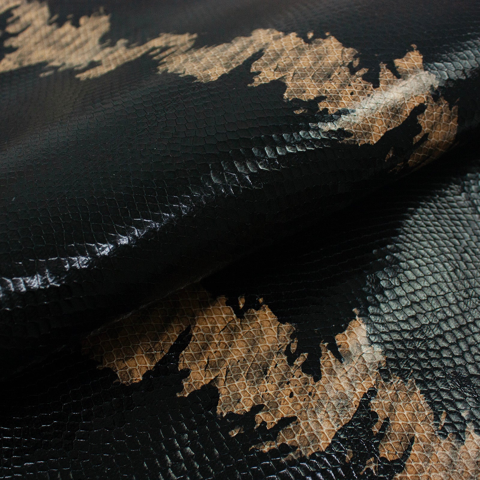 Descripción: Excelente piel de cabra grabada imitación serpiente en color negro con franja marrón, de tacto rígido y apta para usar en cualquiera de tus trabajos en cuero. Esta piel está en perfectas condiciones para su uso.