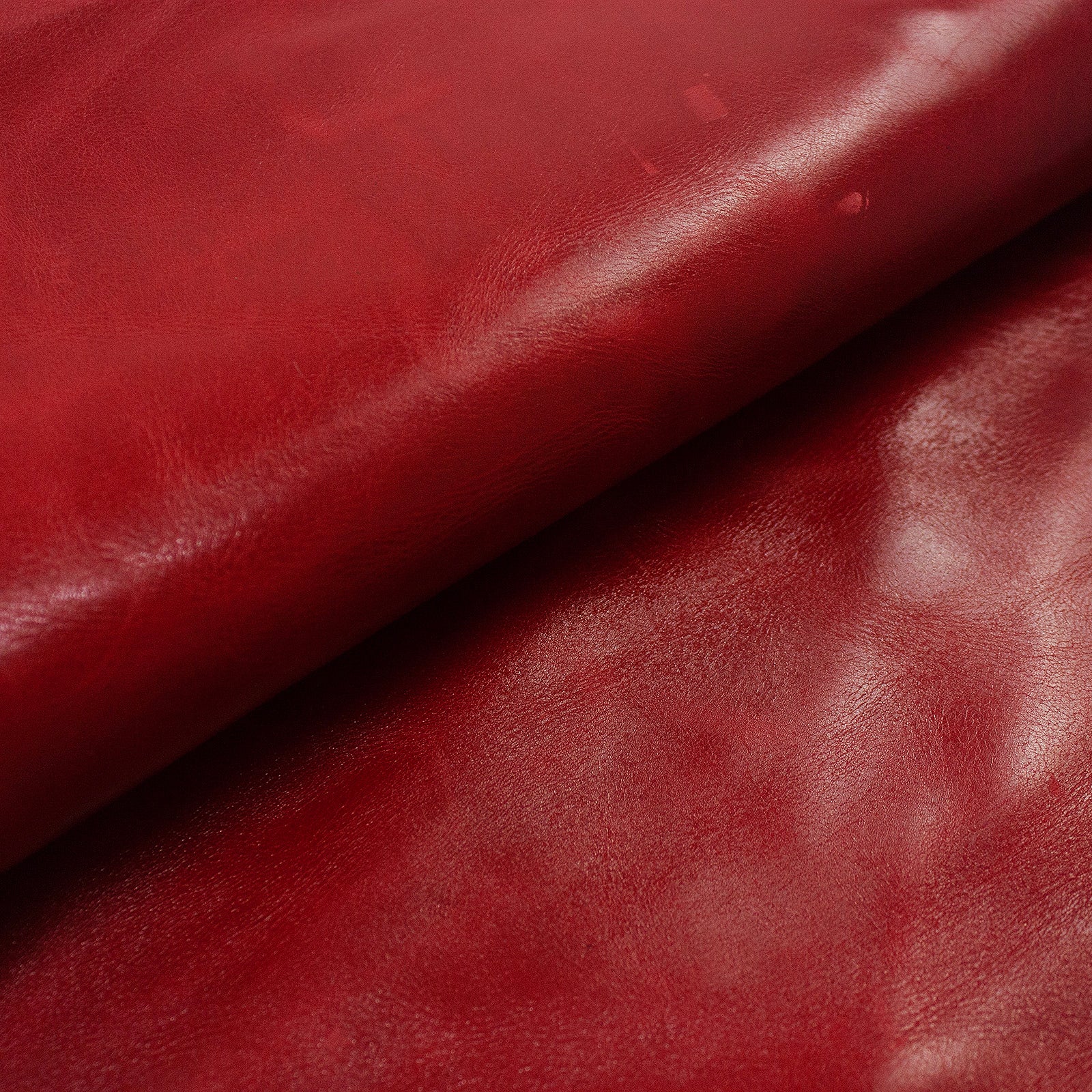 Descripción: Piel de becerro en color rojo envejecido de tacto rígido para usar en cualquiera de tus trabajos en cuero. Esta pieza tiene algunas marcas pequeñas, y un agujero, pero en general está en buenas condiciones para su uso. Acabado en efecto Pull Up.
